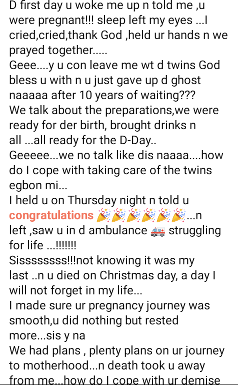 Geeeee…we no talk like dis naaaa….how do I cope with taking care of the twins egbon mi. I held u on Thursday night n told u congratulation. I left, saw u in d ambulance struggling for life !!!!!!!