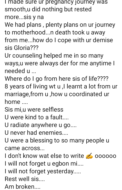 We had plans , plenty plans on ur journey to motherhood…n death took u away from me…how do I cope with ur demise sis Gloria???