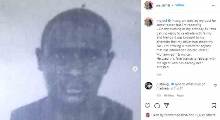 But in an Instagram post on Thursday, Dorcas alleged that the vehicle was stolen by her driver, who according to her, is currently on the run.