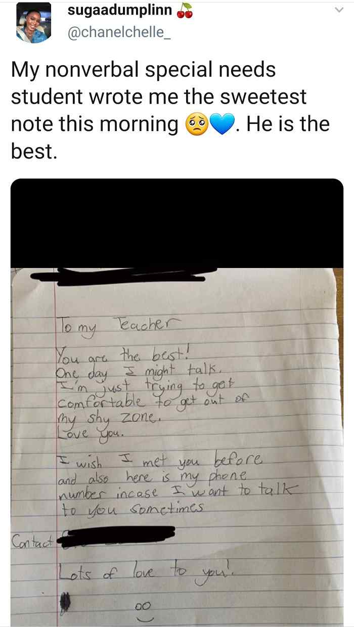 A school teacher has shared the touching note she received from a nonverbal special needs student.