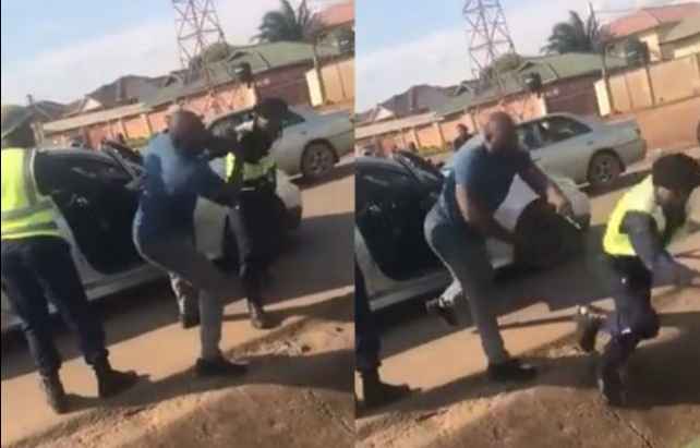 A video has surfaced online showing the moment a motorist fought off three uniformed men who tried to force him out of his car.