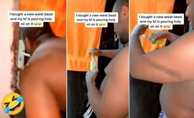Drama As Man Prays, Pours ‘Holy Oil’ On New Waist Beads His Girlfriend Bought (Video)