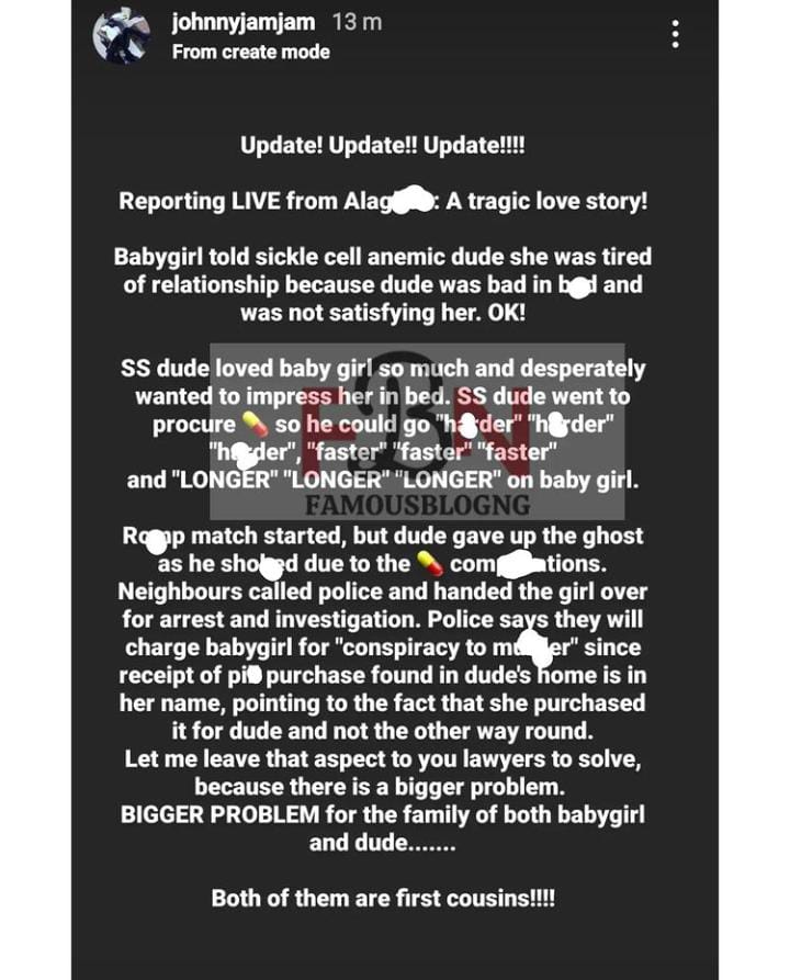 An Instagram user @johnnyjamjam has revealed how the girlfriend of a sickle cell anemic man got arrested after her boyfriend died.