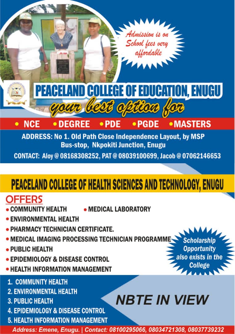 When you want to make references to academic par excellence, I’m verily proud to assert that Peaceland College of Education, Enugu; a citadel of high academic and moral prowess will take the frontier role.