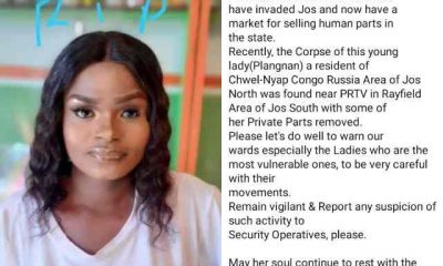 A young lady identified simply as Plangnan, was allegedly found dead in Jos, Plateau State with vital parts of her body missing. According to one Chuwang...